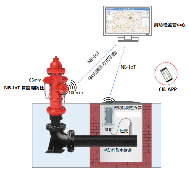 在城市智能消防系统中,装有NB-IoT模块的智能消防火栓和测压器,可顺利获得蜂窝网络把数据实时上报到后台监控中心,如消防栓水压不足、消防栓掉线、消防栓漏水、消防栓损坏、消防栓被非法盗用等终端情况,都会顺利获得系统实时反馈到后台,而后台收到信息后可把相关的信息发送到设备维护人员的手机或APP上,告知某一位置的消防火栓出现了什么问题,需要带哪些设备去维修,甚至在APP上还可规划运维人员与消防栓之间的交通路线。