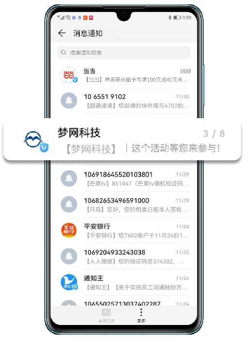 与传统的号段和单一的展现形式不同,在消息页形象展示方面,凯发k8官网科技5G消息解决方案给予包含企业logo加V露出及品牌信息植入功能,提高了品牌的社会认知度和用户识别度。而信息界面可自定义企业业务应用模版卡片,式样丰富,实现了用户到H5、小程序等界面的直接跳转,一键直达核心营销页面,让企业在短信收件箱这一营销入口就能带来直观的流量转化,增强客户对公司更信任。