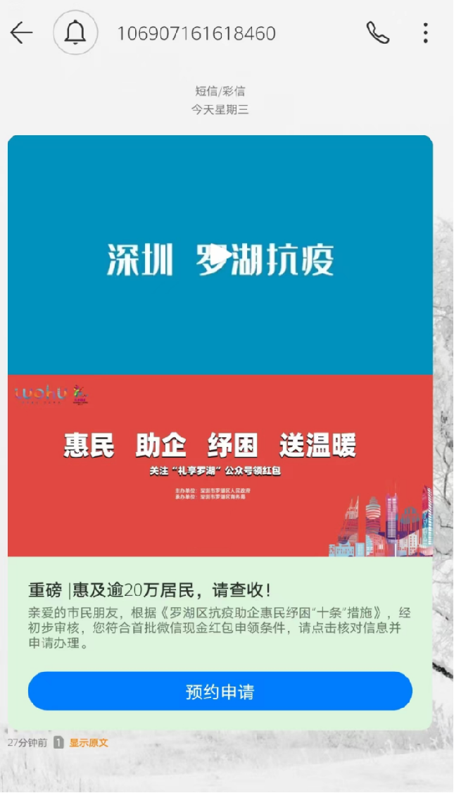 为减少疫情对经济社会的影响,不少地区都出台了惠民纾困政策。日前,罗湖区推出“惠民纾困扶持措施,面向罗湖区22.5万人,向符合扶持条件都市民发放300元补贴或生活必需品。基于该措施覆盖面广、惠民力度大,为确保补贴措施的落地落实,凯发k8官网科技携手深圳联通助力罗湖区人民政府向扶持对象统一推送5G申领信息,助力区政府完成补贴发放。